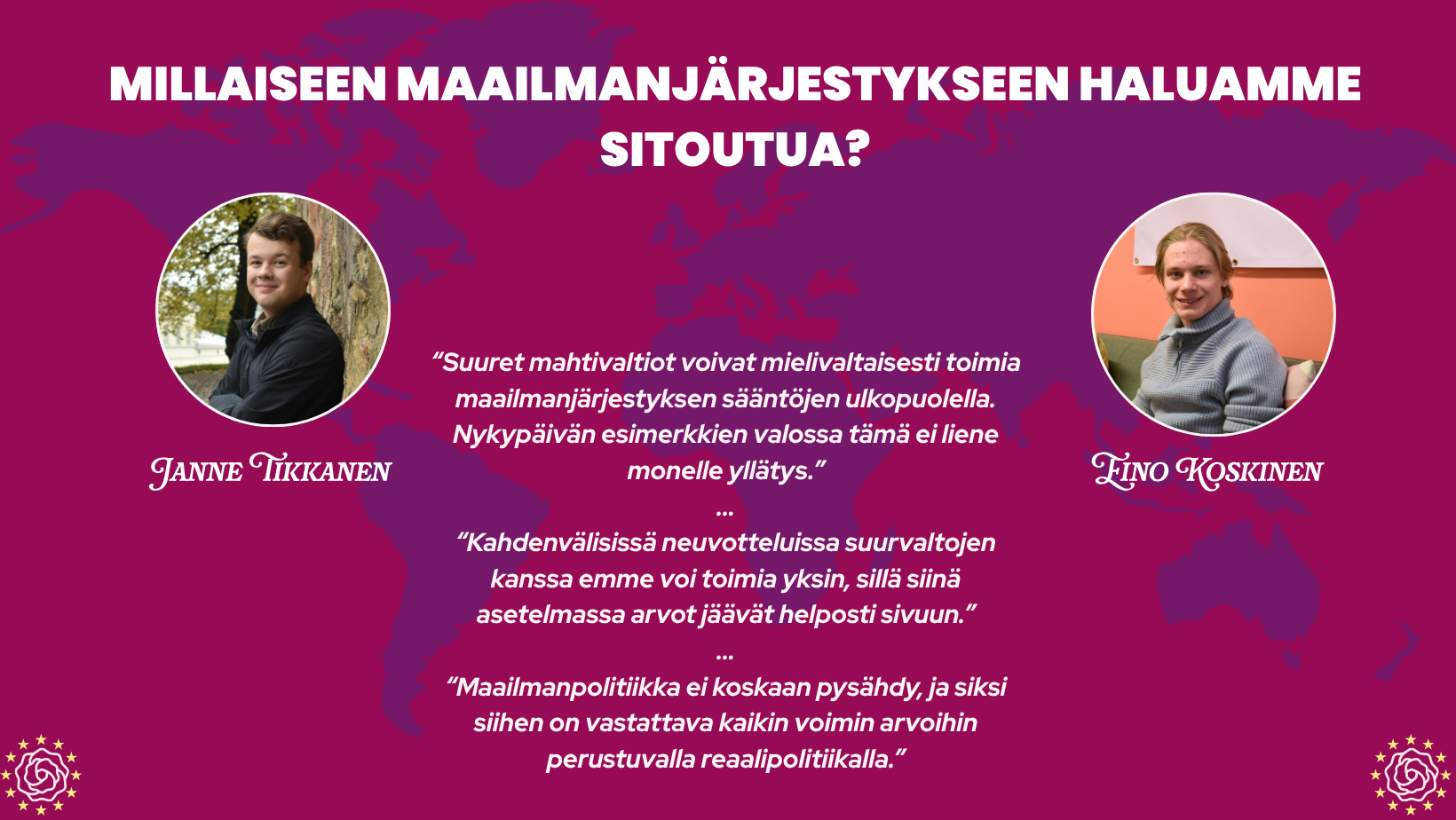 Realismia ei kuitenkaan voida täysin unohtaa. Presidentti Stubbin johdolla Suomi on asemoitunut poikkeuksellisen hyvään asemaan. Myös EU- ja Nato-jäsenyys ovat vahvistaneet asemaamme. Arvoilla on oltava paikkansa niissä pöydissä, joihin realismi on meidät ohjannut. Pelkkään reaalipolitiikkaan kyynistyminen ei voi olla Suomen ulkopoliittinen linja. Suomi on perinteisesti ajanut rauhaa, diplomatiaa ja ihmisoikeuksia. Tiedämme suurvaltojen toiminnasta paremmin kuin moni muu maa kiitos maantieteellisen asemamme. Ymmärrämme, ettei Venäjän neuvotteluhalukkuus ole niin vahvaa kuin Trump ehkä haluaisi uskoa. JEF-kokouksessa todettiin, että Ukrainan rauhanprosessi on käytännössä pysähtynyt.